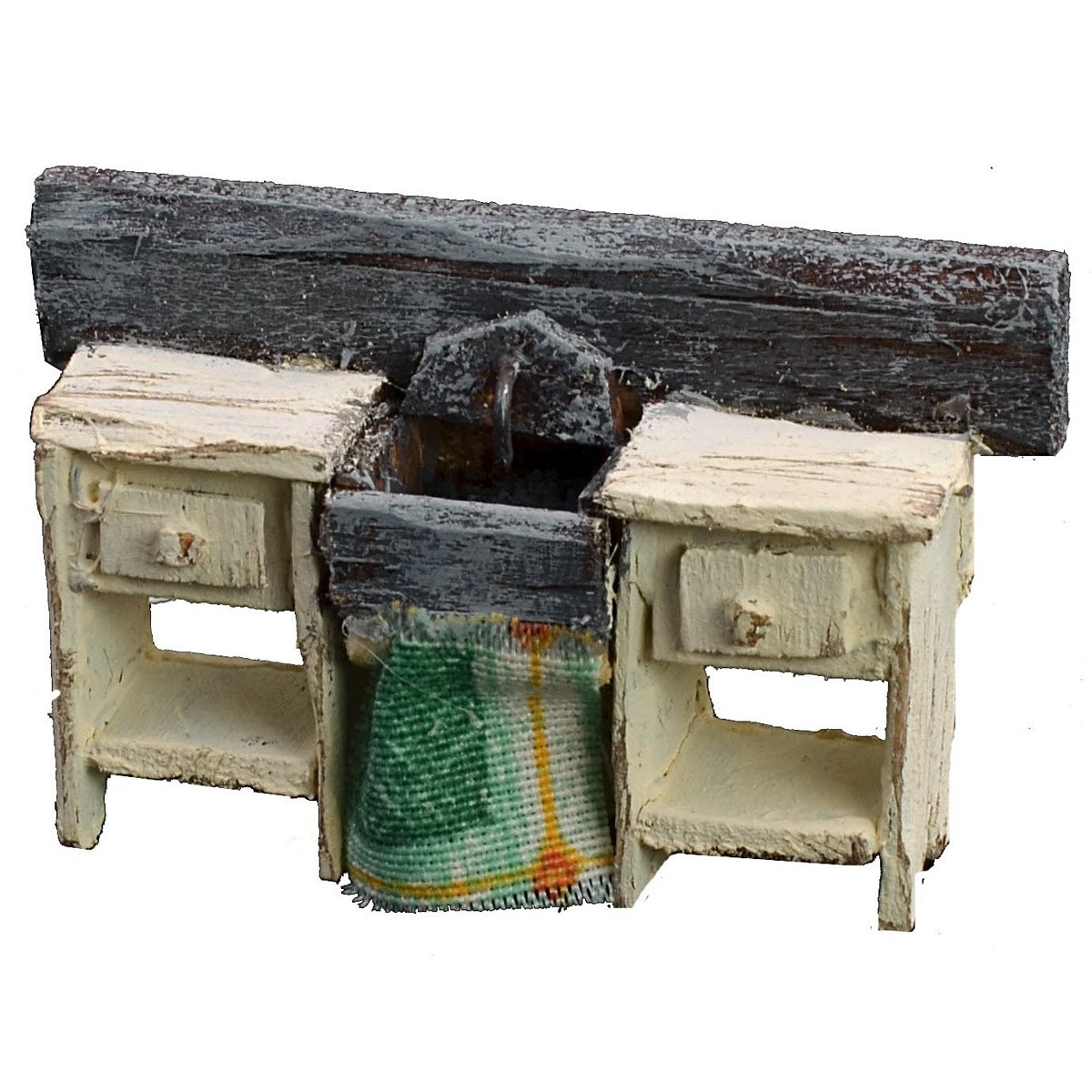 Fregadero de cocina de madera clara con cajoneras laterales y decorado con una toalla verde, el objeto es ideal para el Belén hecho a mano o las casas de muñecas. El artículo ha sido producido por artesanos italianos y se recomienda para estatuas de altura 5-6 cm. En los productos relacionados debajo de la tabla hay otros complementos de decoración de la misma serie para poder completar sus escenarios.
