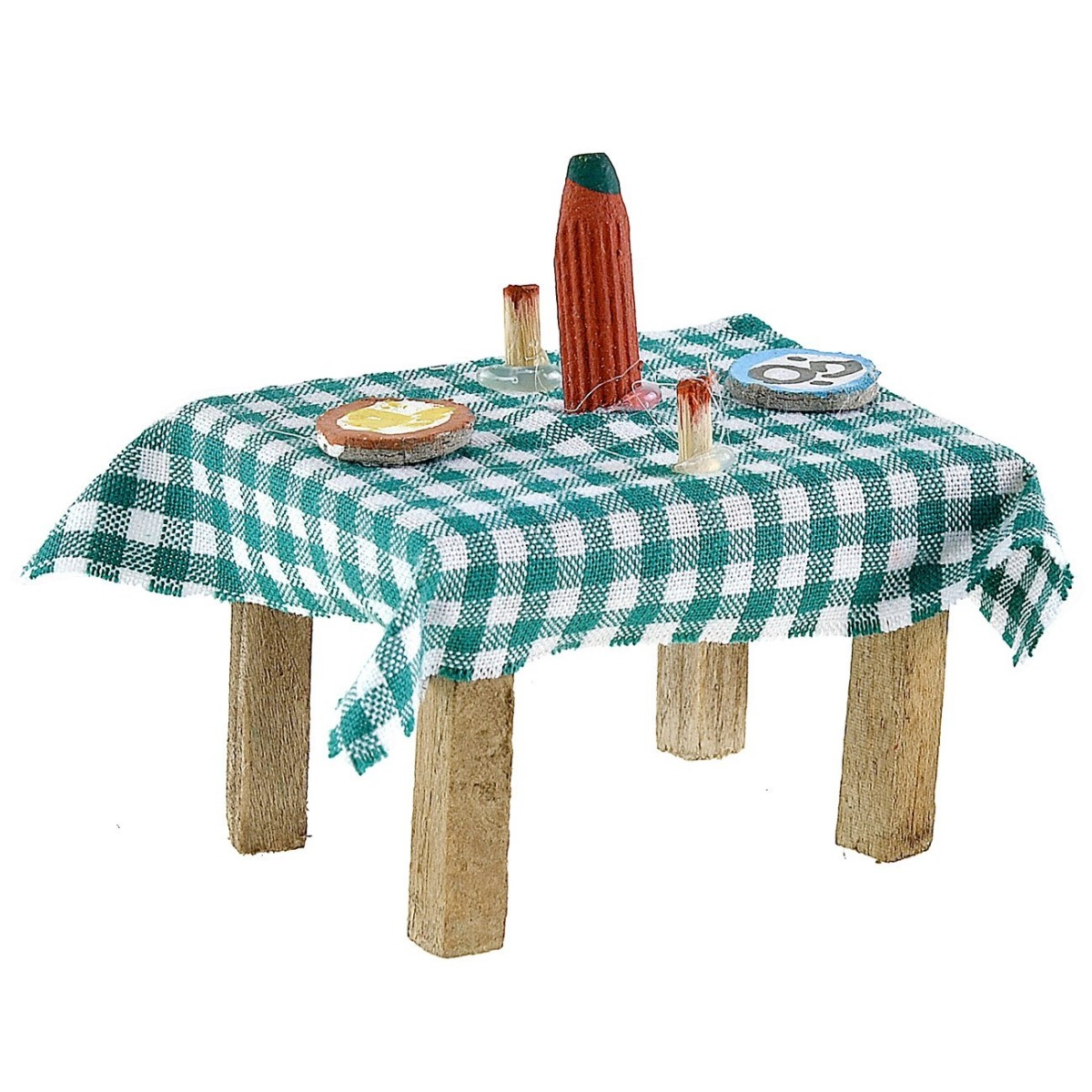 Mesa rectangular de madera con mantel a cuadros en colores surtidos y equipada con platos, vasos y botella. El artículo es recomendado para estatuas de altura de 8 cm y es ideal para la creación de ambientes hogareños. El accesorio está hecho artesanalmente en Italia.