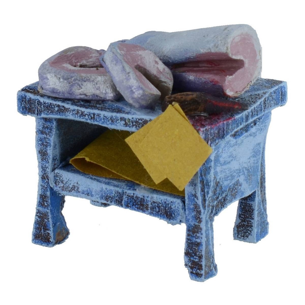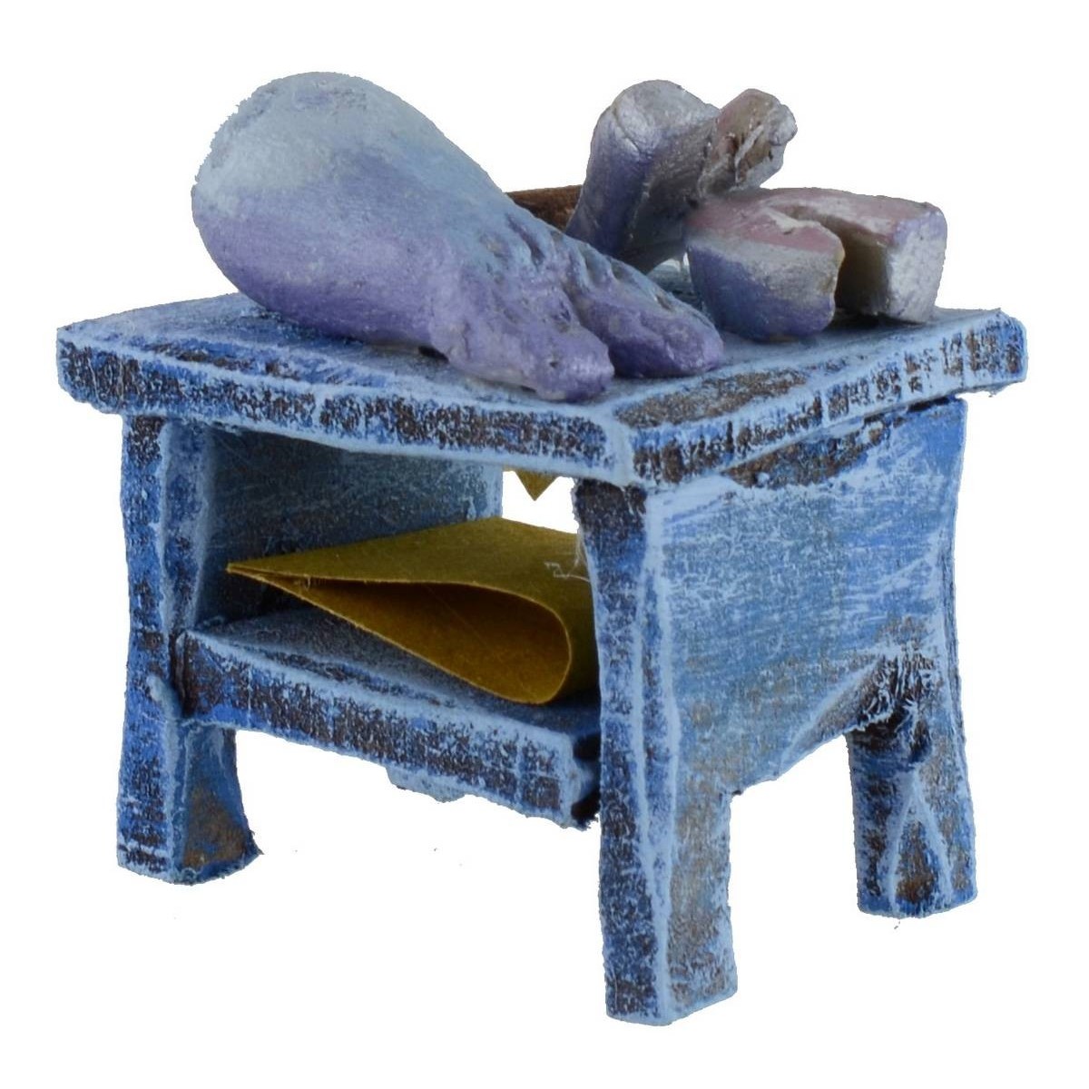 Banco de madera con pez de terracota, hecho completamente a mano y recomendado para estatuas de altura de 6 cm.