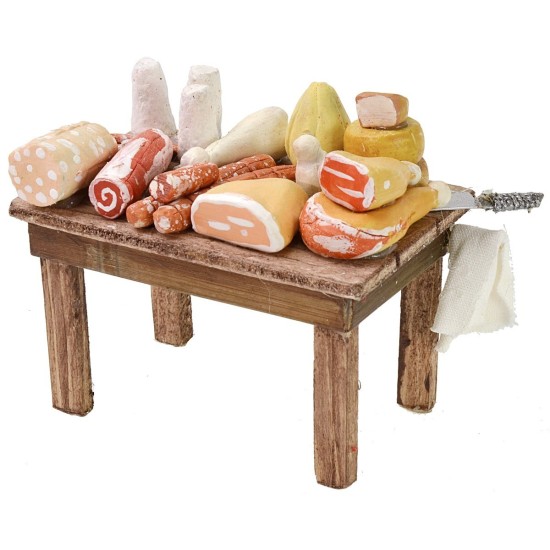Banco artesanal de madera con embutidos y quesos en terracota bien acabados. Al ser un producto completamente hecho a mano, los colores pueden variar respecto a la foto. Recomendado para estatuas de altura 10-12 cm.