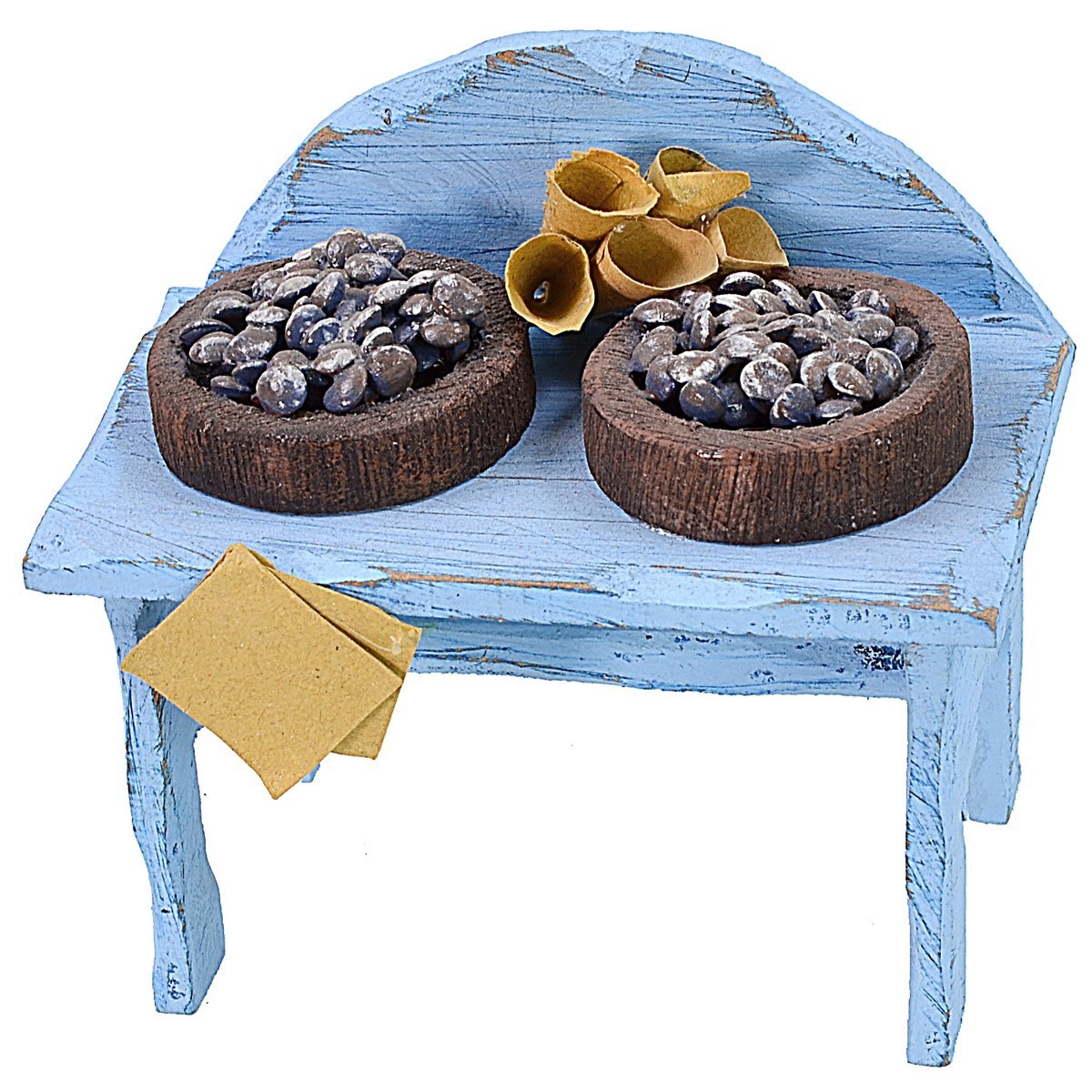 Banco con recipientes de almejas, recomendado para estatuas de altura 10-12 cm, ideal para la creación de mercados en el Belén.