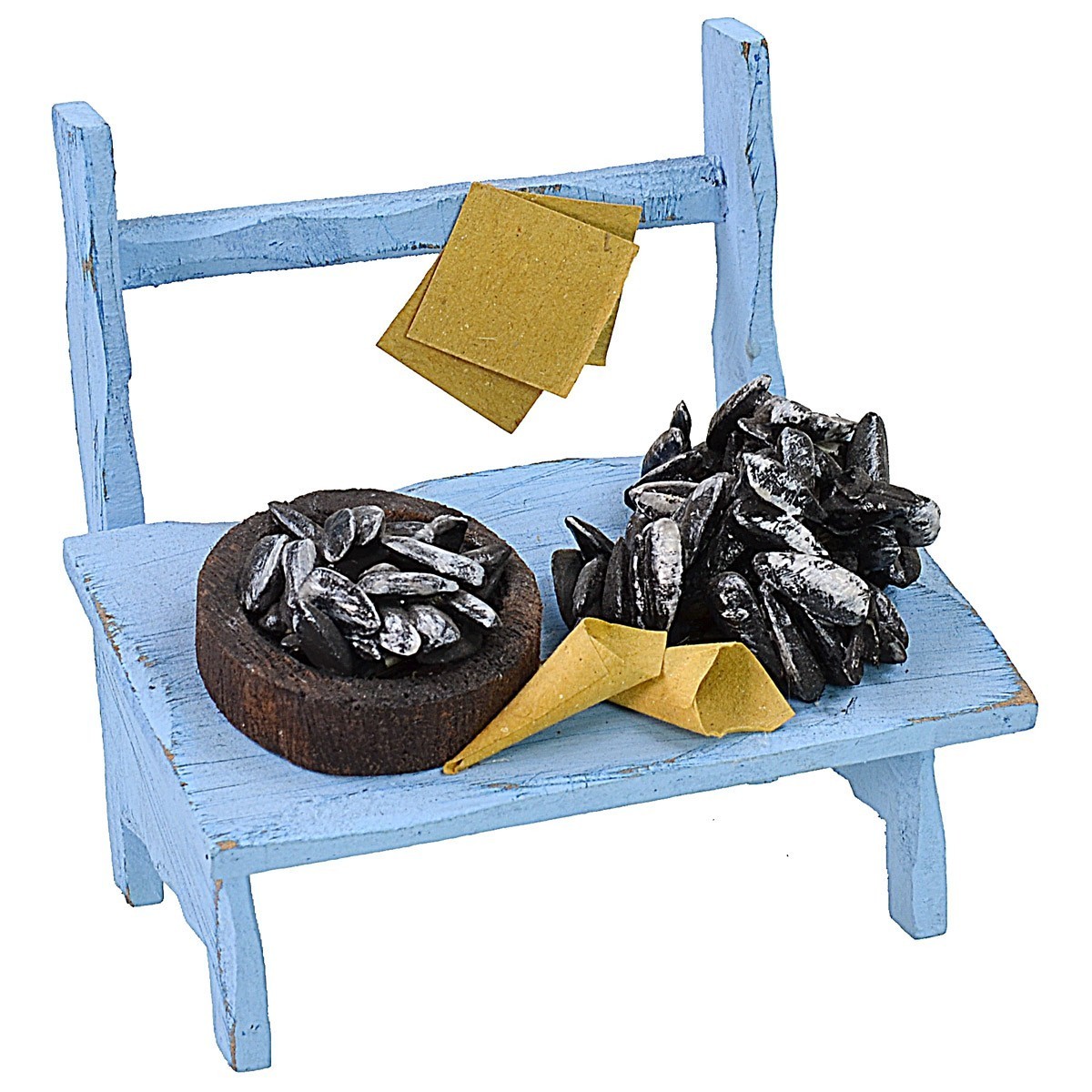 Banco con cuencos de mejillones, recomendado para estatuas de altura 10-12 cm, ideal para la creación de mercados en el Belén. Producto artesanalmente realizado en madera.