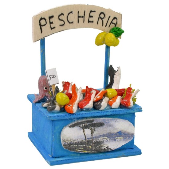 Puesto del pescadero realizado artesanalmente por hábiles manos italianas utilizando madera para la estructura y pintando a mano la terracota para las miniaturas. El producto está bien acabado en los detalles: tiene el letrero en la parte superior y está lleno de miniaturas que representan el pescado fresco. Producto recomendado para dar un toque de originalidad a su Belén. Detrás del mostrador de exhibición se pueden colocar estatuas de 6,5 cm de altura, mientras que a los lados y delante del mostrador también se pueden colocar estatuas de 8 cm de altura según sus gustos y preferencias.