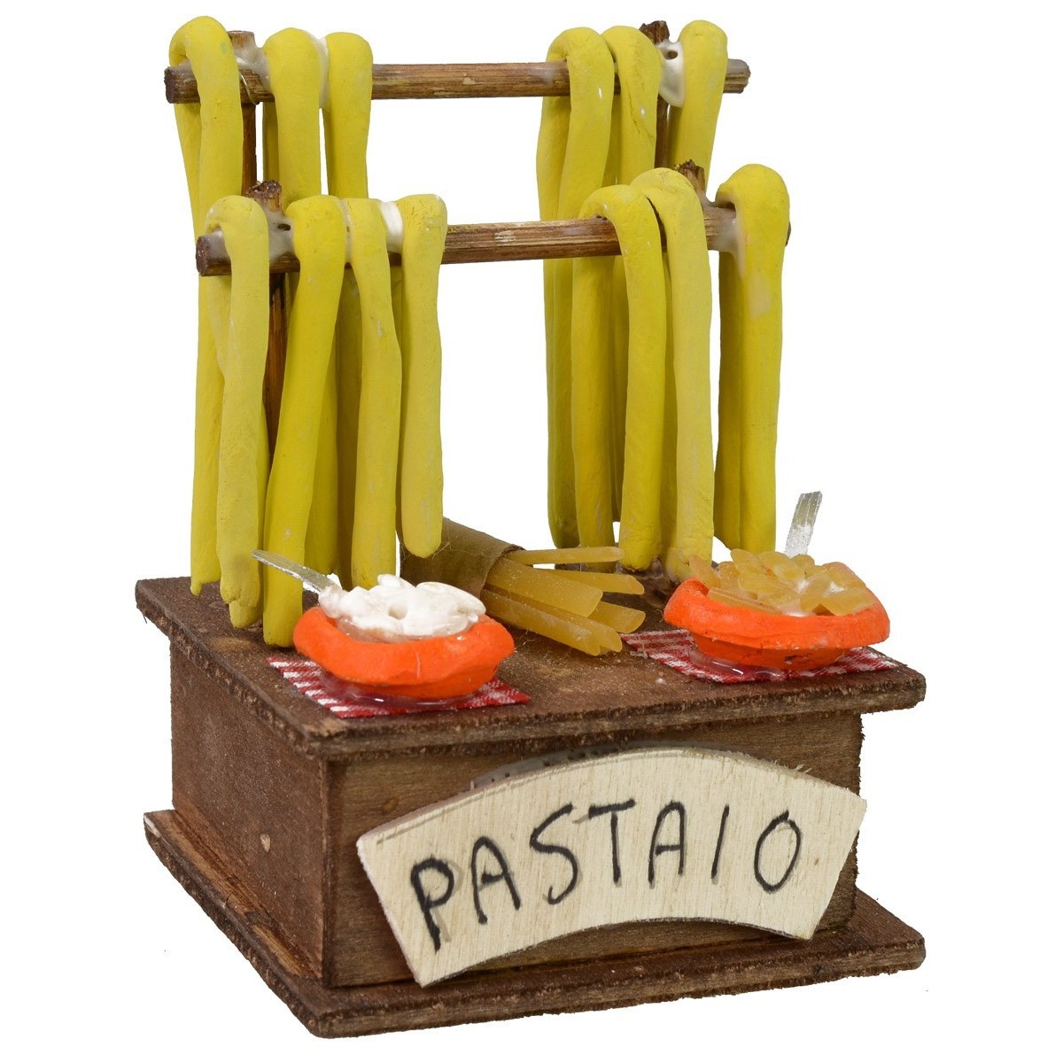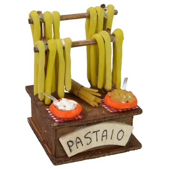Puesto del fabricante de pasta realizado artesanalmente por hábiles manos italianas utilizando madera para la estructura y pintando a mano la terracota para los detalles. El producto está bien acabado en los detalles: tiene el letrero en la parte superior y está lleno de miniaturas que representan la pasta fresca extendida y la ya cocinada dentro de los platos. Producto recomendado para dar un toque de originalidad a su Nacimiento. Detrás del mostrador se pueden colocar estatuas de 6,5 cm de altura, mientras que a los lados y frente al mostrador también se pueden colocar estatuas de 8 cm de altura según sus gustos y preferencias.