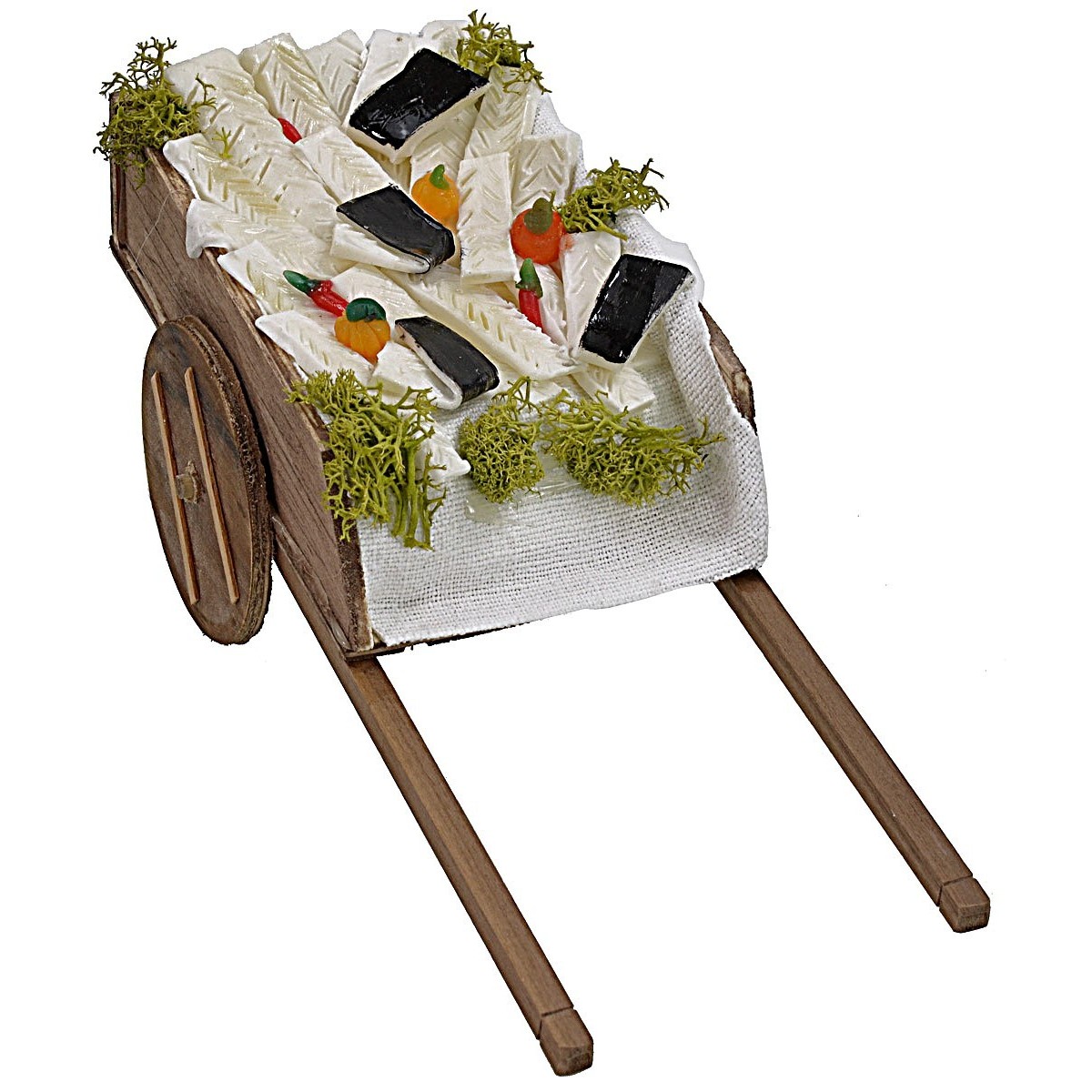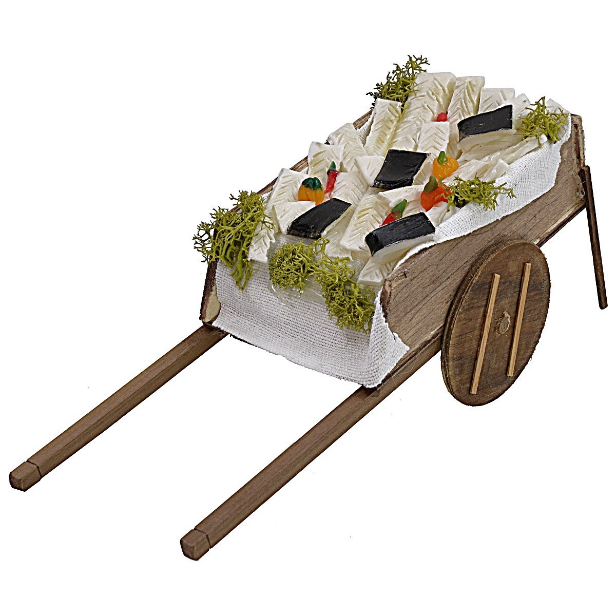 Carro de madera con variedad de pescado en cera pintada, recomendado para estatuas de altura 20-24 cm.