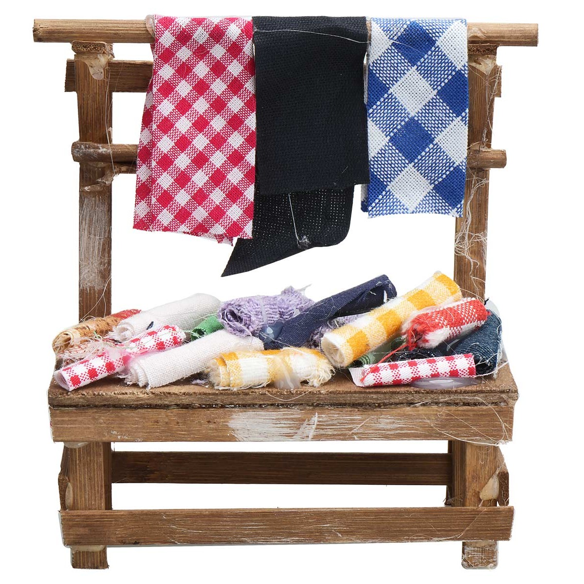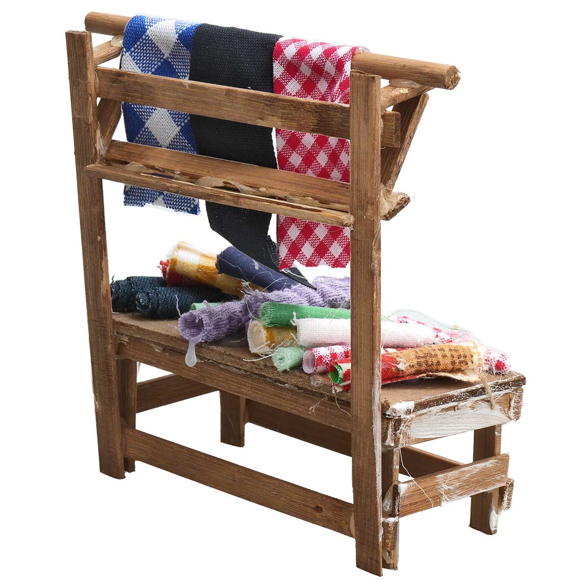 Puesto de madera con estructura vertical donde cuelgan telas de colores, mientras que en la superficie están expuestos varios rollos de tejidos.