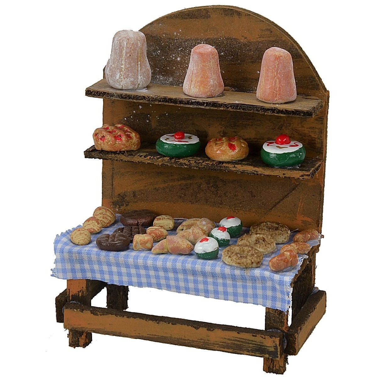 Puesto del pastelero realizado artesanalmente por hábiles manos italianas con estructura de madera, adornado con varios tipos de pasteles, galletas y brioches. Este artículo se recomienda para estatuas de altura 10-12 cm y se especifica que al ser un producto hecho a mano podría variar ligeramente respecto a la foto. En la sección MINUTERIE están disponibles muchos accesorios para belén para combinar.