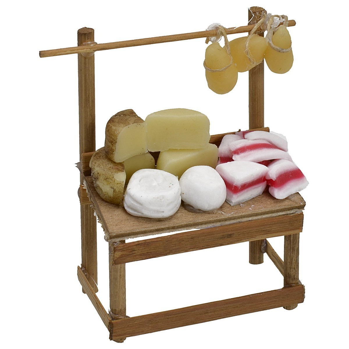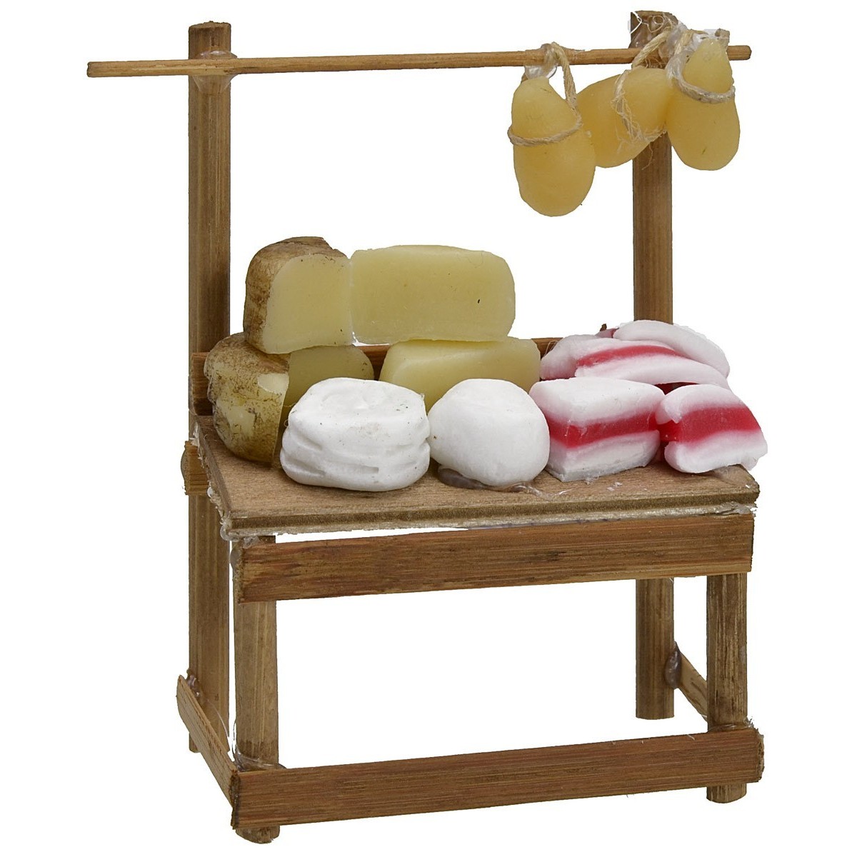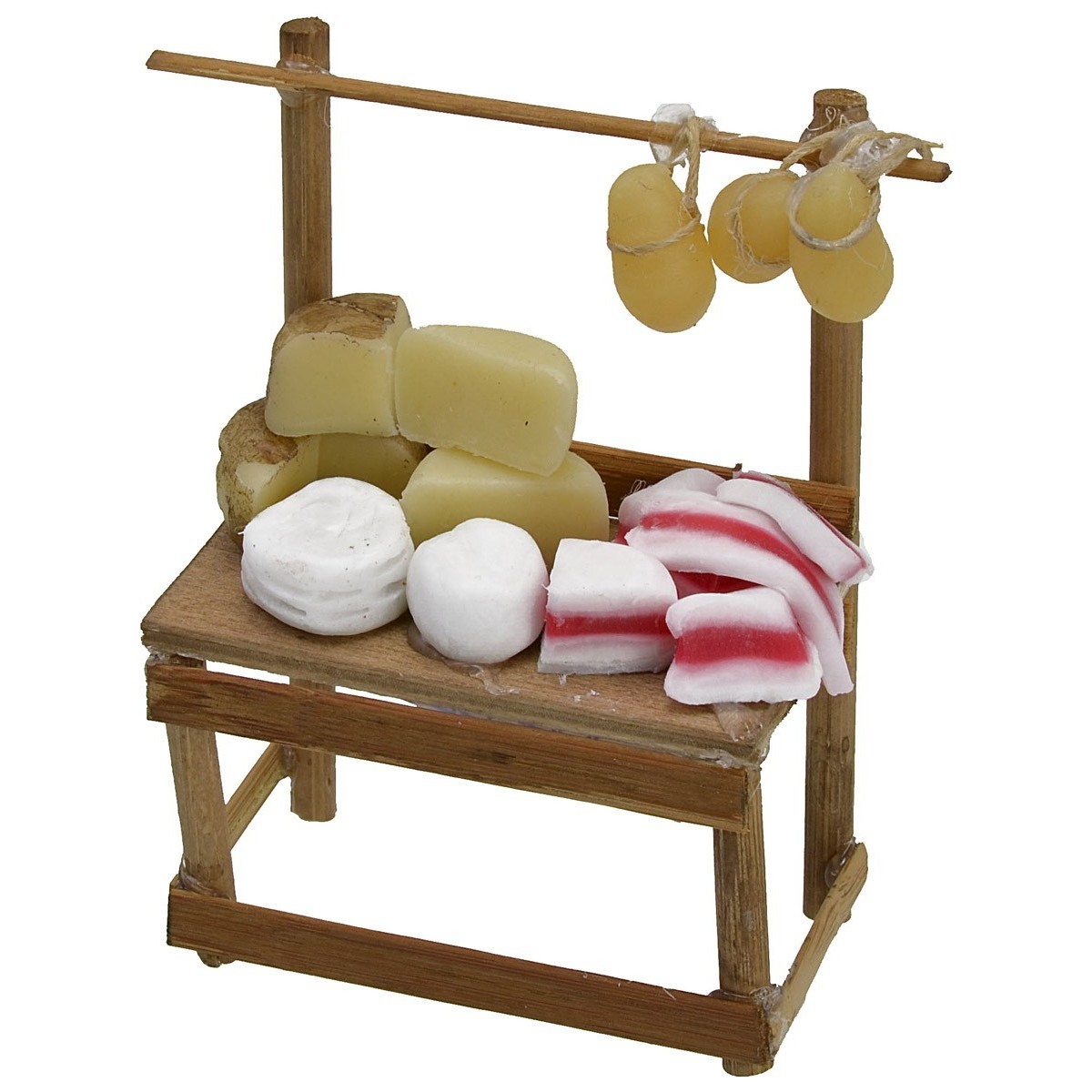 Puesto con estante de madera donde se exhiben muchos tipos de quesos y embutidos. Este artículo ha sido realizado artesanalmente por manos expertas italianas utilizando madera para la estructura y cera para la miniatura. El artículo está recomendado para estatuas de altura 10 cm, se precisa que al ser un producto hecho a mano podría variar ligeramente respecto a la foto. En la sección MINUTERIE hay disponibles muchos accesorios para el belén para combinarlos y personalizarlo.