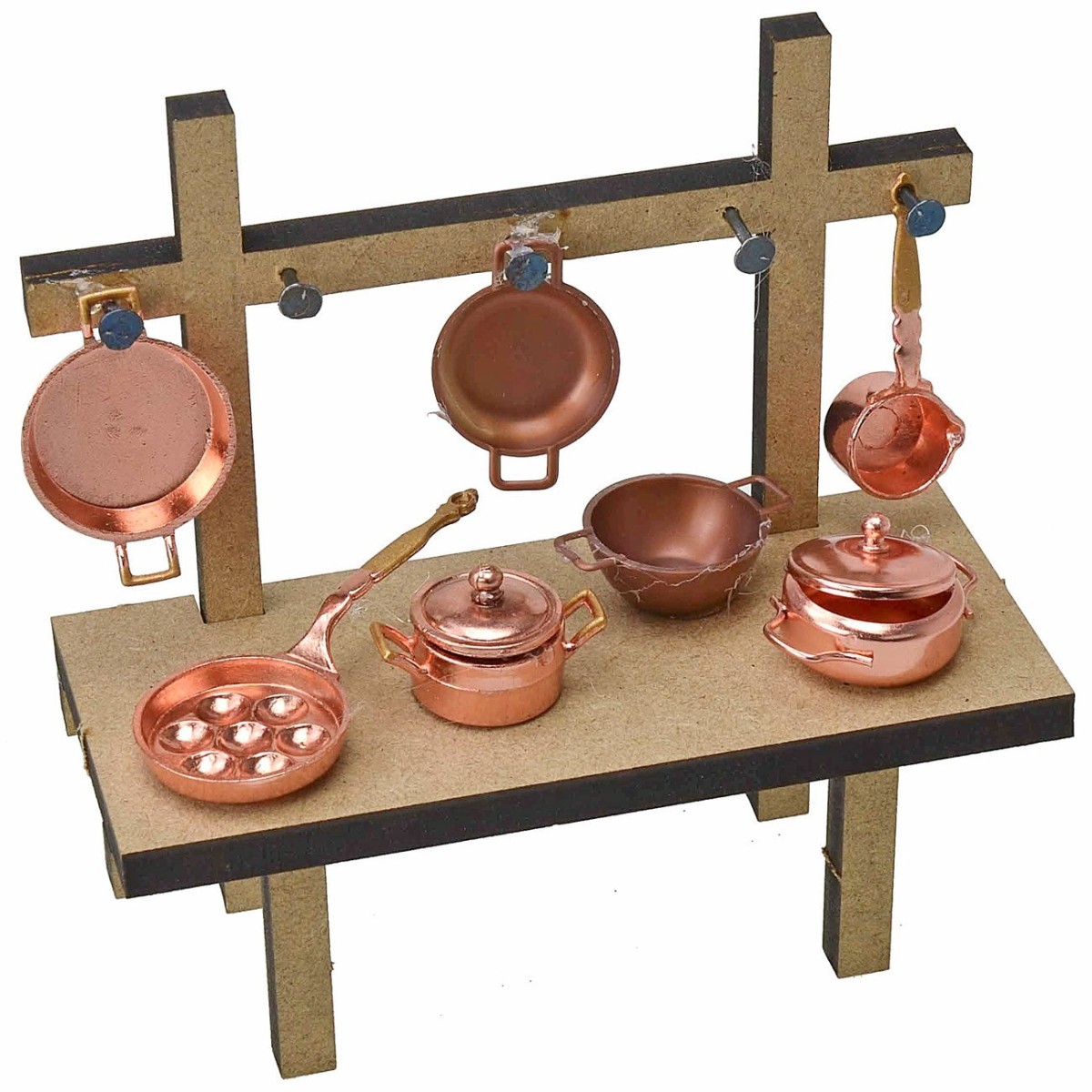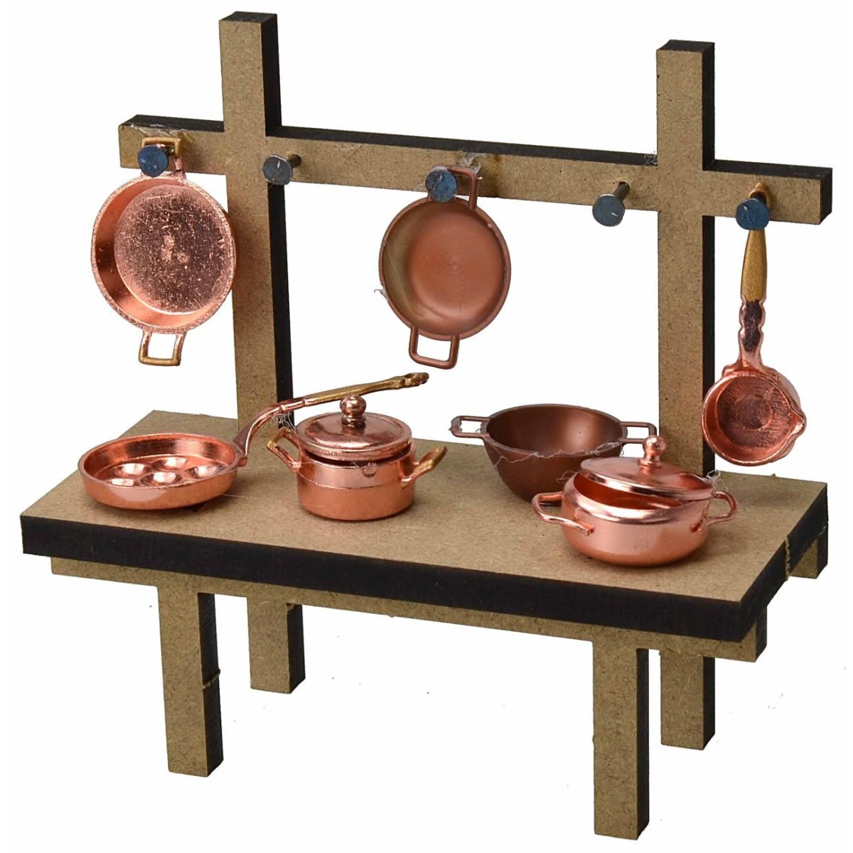 Puesto realizado artesanalmente en madera, decorado con ollas de cobre. Recomendado para estatuas de altura 10-12 cm.