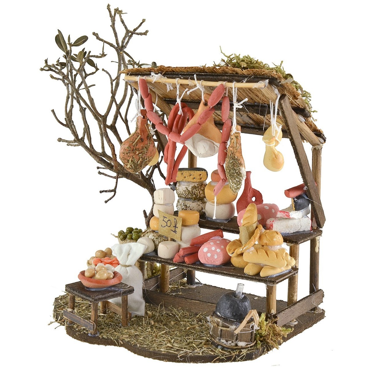 Ambientación para belén, el puesto está decorado con productos variados, incluyendo: quesos, embutidos, pan, huevos, aceitunas, etc. El artículo está realizado en terracota pintada. El producto está recomendado para figuras de 12 cm de altura y ha sido elaborado artesanalmente en Italia.