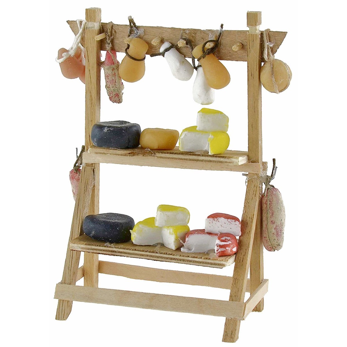 Puesto con estante de madera donde se exhiben muchos tipos de quesos y embutidos. Este artículo ha sido realizado artesanalmente por manos expertas italianas utilizando la madera para la estructura y cera para la miniatura. El artículo está recomendado para estatuas de altura 10 cm, se precisa que al ser un producto hecho a mano podría variar ligeramente respecto a la foto. En la sección MINUTERIE están disponibles muchos accesorios para el belén para combinarlos y personalizarlos.