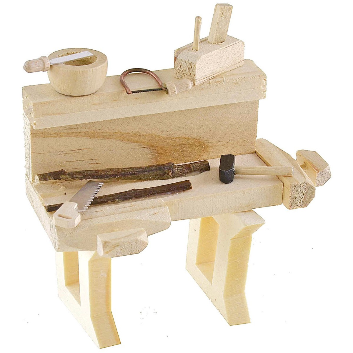 Banco de trabajo para carpintero realizado en madera clara. La superficie de trabajo presenta piezas de madera y en la parte superior un cepillo y un cuenco. Recomendado para estatuas de altura 12 cm. es ideal para la creación de un taller. En la fotografía demostrativa se presentan algunas miniaturas para completar el artículo disponibles en nuestro sitio.