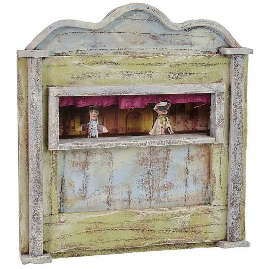 Teatrillo de madera con marionetas para belén, la estructura reproduce perfectamente la madera y se caracteriza por un dintel en forma de onda y el gran telón rectangular donde se mostraban las marionetas. Artículo realizado en madera y es adecuado para estatuas de altura 8-10 cm. Se precisa que al ser un producto artesanal el artículo podría diferir ligeramente de la foto.