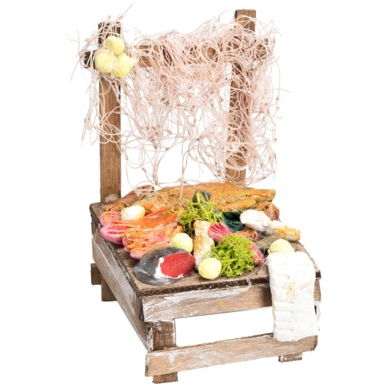 Mostrador del pescado montado con red colgada y variedad de productos pesqueros en miniatura, como crustáceos, peces y mariscos, recreados en detalle.