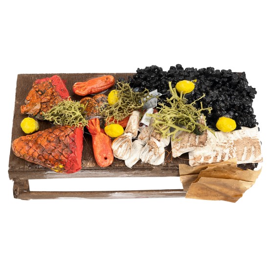 Puesto de pescado lleno de mercancía para vender, recomendado para figuras de altura 11-12 cm.