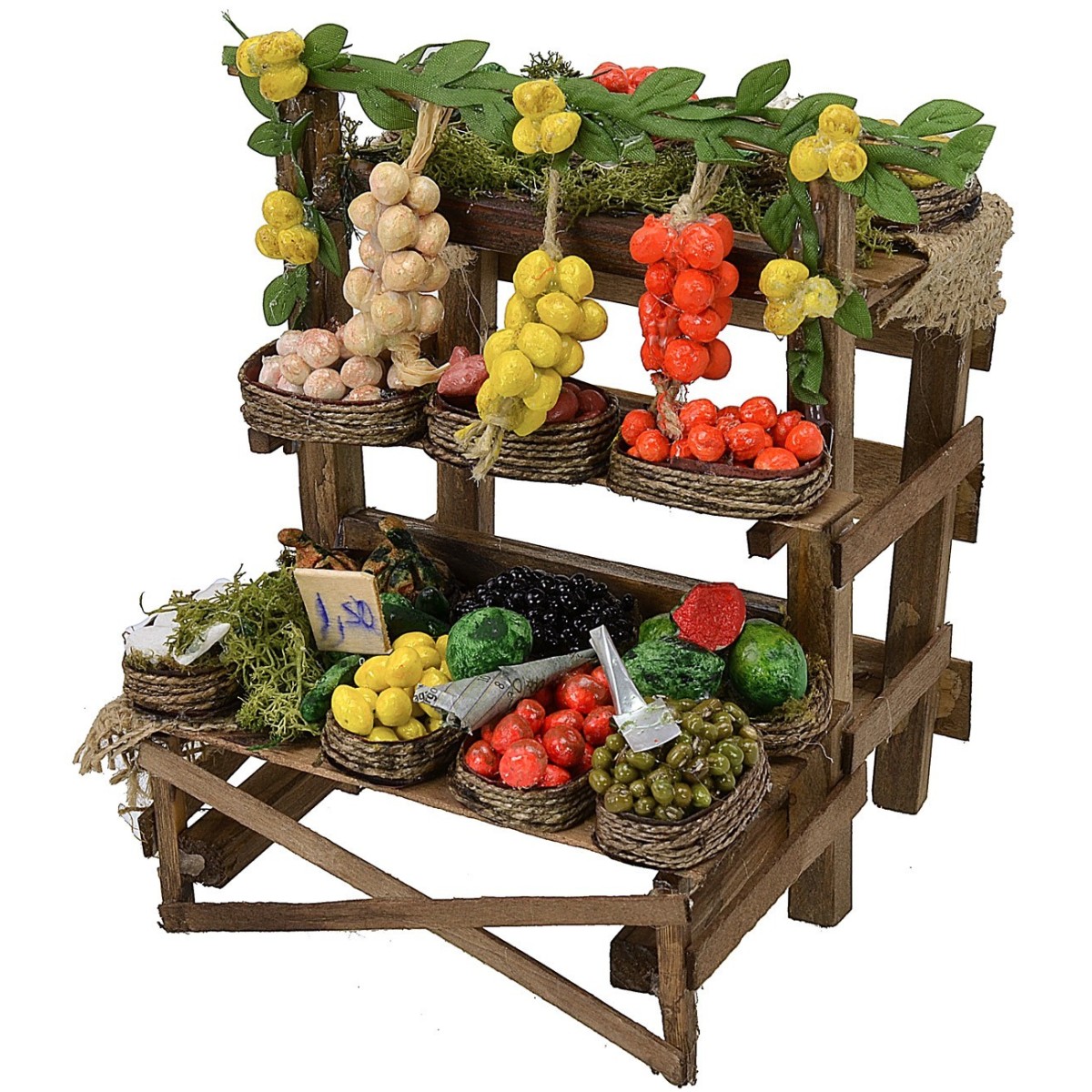 Banco artesanal de frutas y verduras en modelos surtidos, la decoración de frutas y verduras varía para cada pieza.
