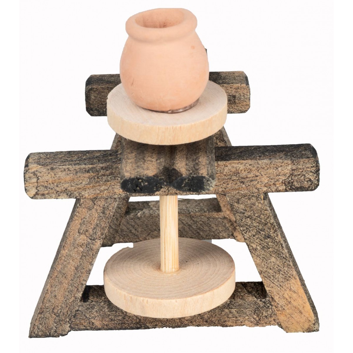 Banco de trabajo para el alfarero hecho de madera con jarrón de terracota. Se recomienda para estatuas de belén de altura de 10-12 cm, en los detalles del producto encontrarás específicamente las alturas y series proporcionadas.