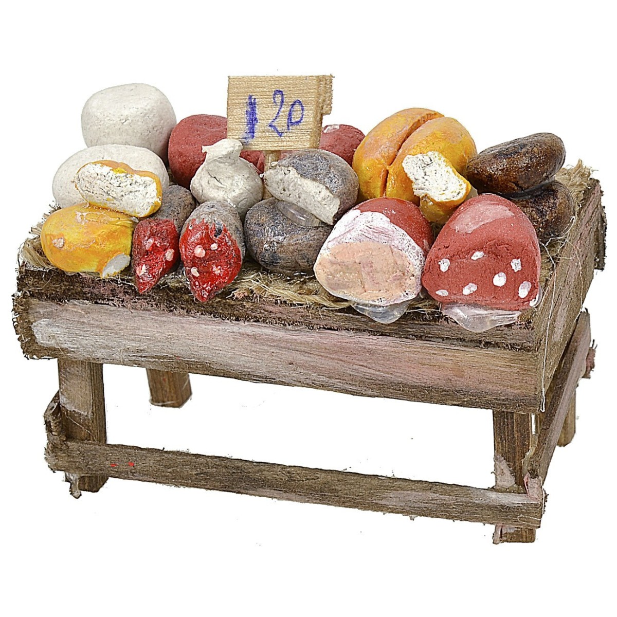 Puesto de mercado de belén con embutidos y quesos de 6,5x4x4 cm.