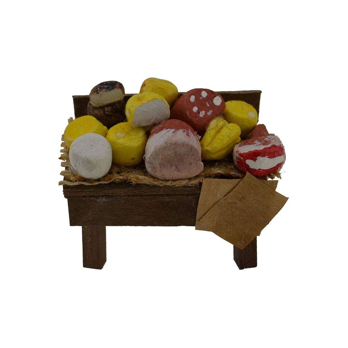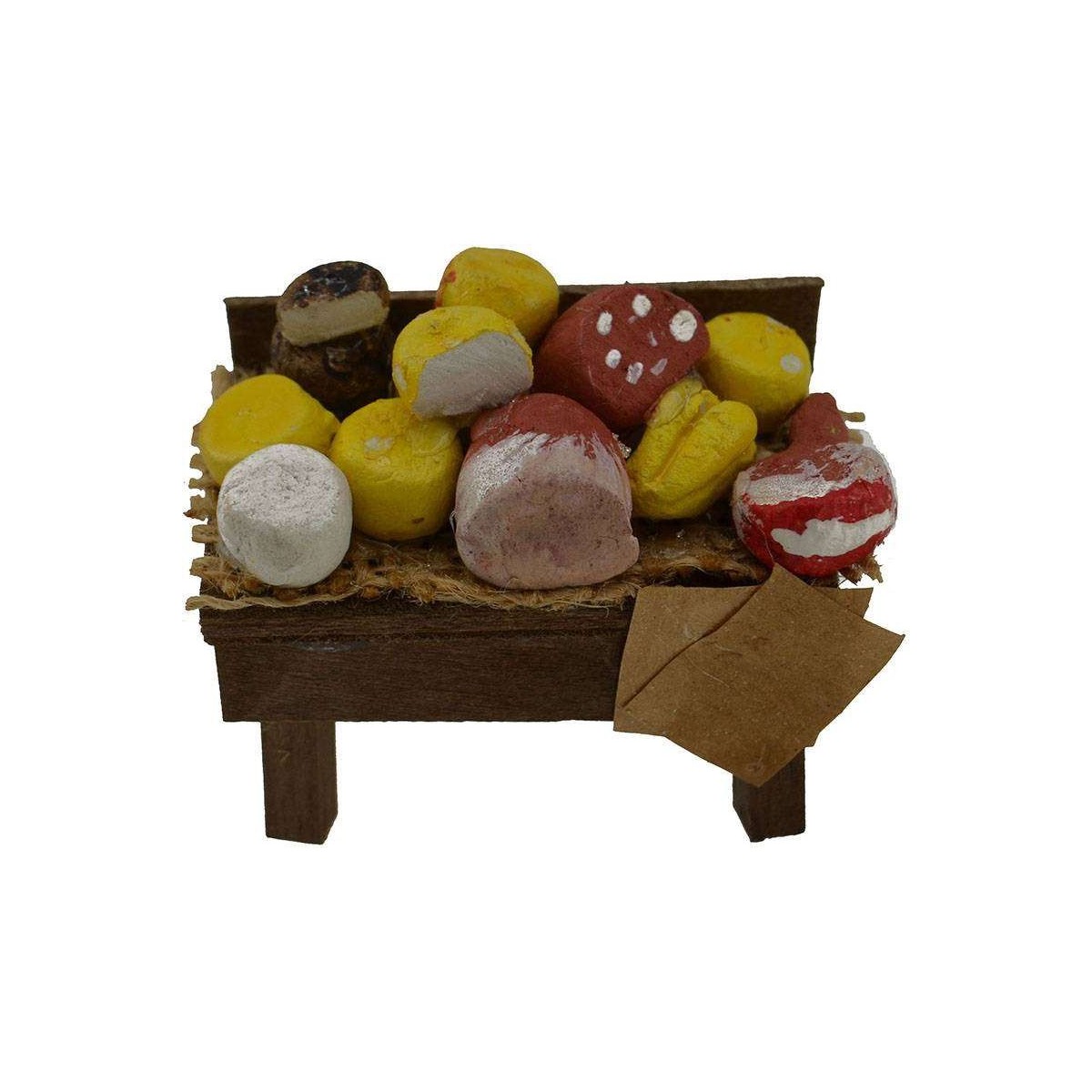 Puesto de madera con embutidos y quesos surtidos, recomendado para estatuas de altura 5-6 cm.