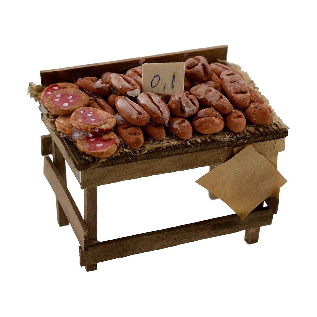 Banco de madera con pan y pizzas de terracota realizado completamente a mano, recomendado para estatuas de altura de 12-15 cm.