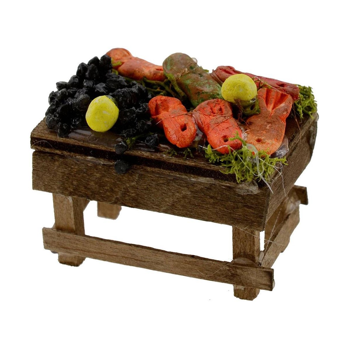 Banco de madera del pescadero con pescado en terracota realizado completamente a mano, recomendado para estatuas de altura 6,5-8 cm. Se precisa que siendo productos artesanales el pescado expuesto puede variar respecto a la foto.
