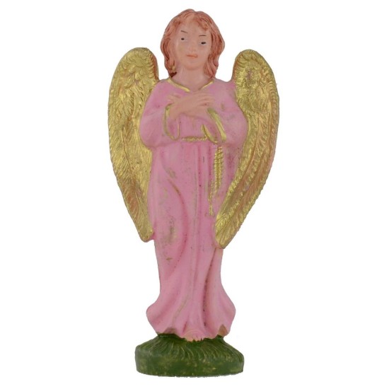 Ángel de pie, de color rosa, serie de 10 cm en pvc. Las estatuas de la misma serie tienen rostros expresivos y bien detallados.