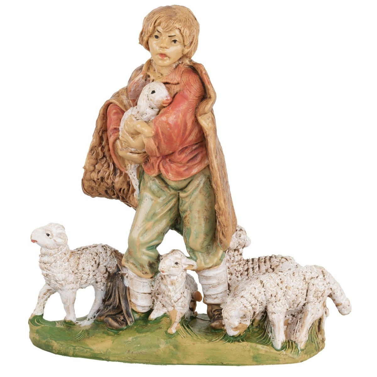 Pastor con rebaño de ovejas de 10 cm de altura. La estatua está hecha de pvc y producida en Italia por Euromarchi.