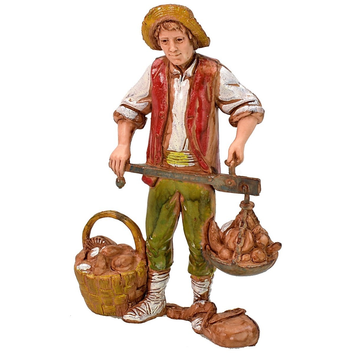 Vendedor con balanza y cesta de setas serie 10 cm Landi Moranduzzo. Se precisa que la mencionada serie mide realmente alrededor de 8,5-9 cm de altura. Las estatuas de esta marca se caracterizan por el cuidado en la expresividad de los rostros y de cada detalle individual, de hecho, todas las series firmadas por Landi son producidas y pintadas a mano en Italia.