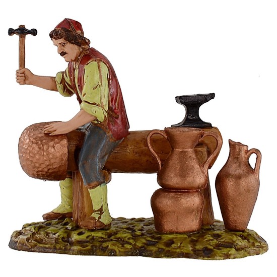 Artesano sentado trabajando el cobre, escena para belén serie Landi Moranduzzo 10 cm. Se precisa que la mencionada serie mide realmente alrededor de 8,5-9 cm de altura. Las estatuas de esta marca se caracterizan por el cuidado en la expresividad de los rostros y de cada detalle individual, de hecho, todas las series firmadas Landi son producidas y pintadas a mano en Italia.
