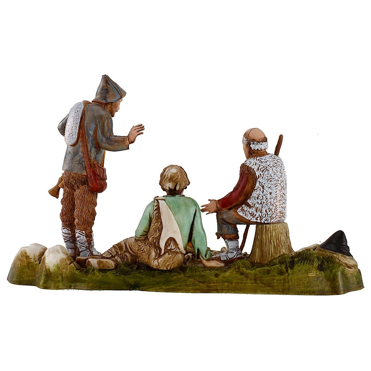 Tres hombres alrededor del fuego, escena para belén serie Landi Moranduzzo 10 cm. Cabe precisar que la mencionada serie mide realmente unos 8,5-9 cm de altura. Las estatuas de esta marca se caracterizan por el cuidado en la expresividad de los rostros y de cada detalle, de hecho, todas las series firmadas por Landi son producidas y pintadas a mano en Italia.