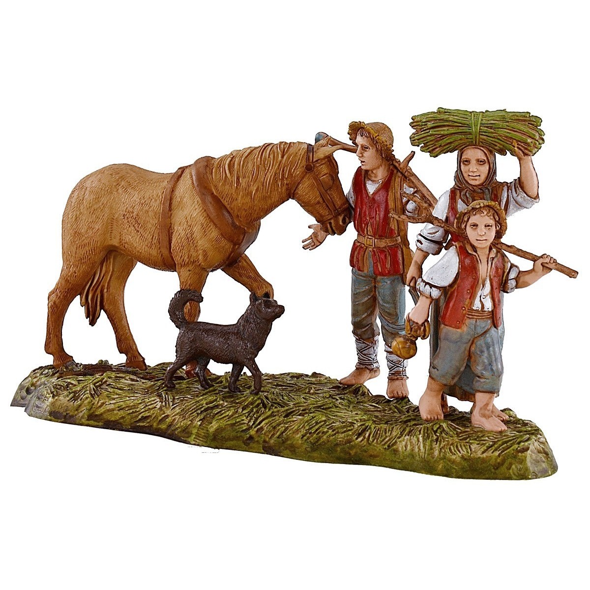 Familia de campesinos con perro y caballo, escena para belén de la serie Landi Moranduzzo 10 cm. Se precisa que la mencionada serie mide realmente alrededor de 8,5-9 cm de altura. Las estatuas de esta marca se caracterizan por el cuidado en la expresividad de los rostros y cada detalle individual; de hecho, todas las series firmadas por Landi son producidas y pintadas a mano en Italia.