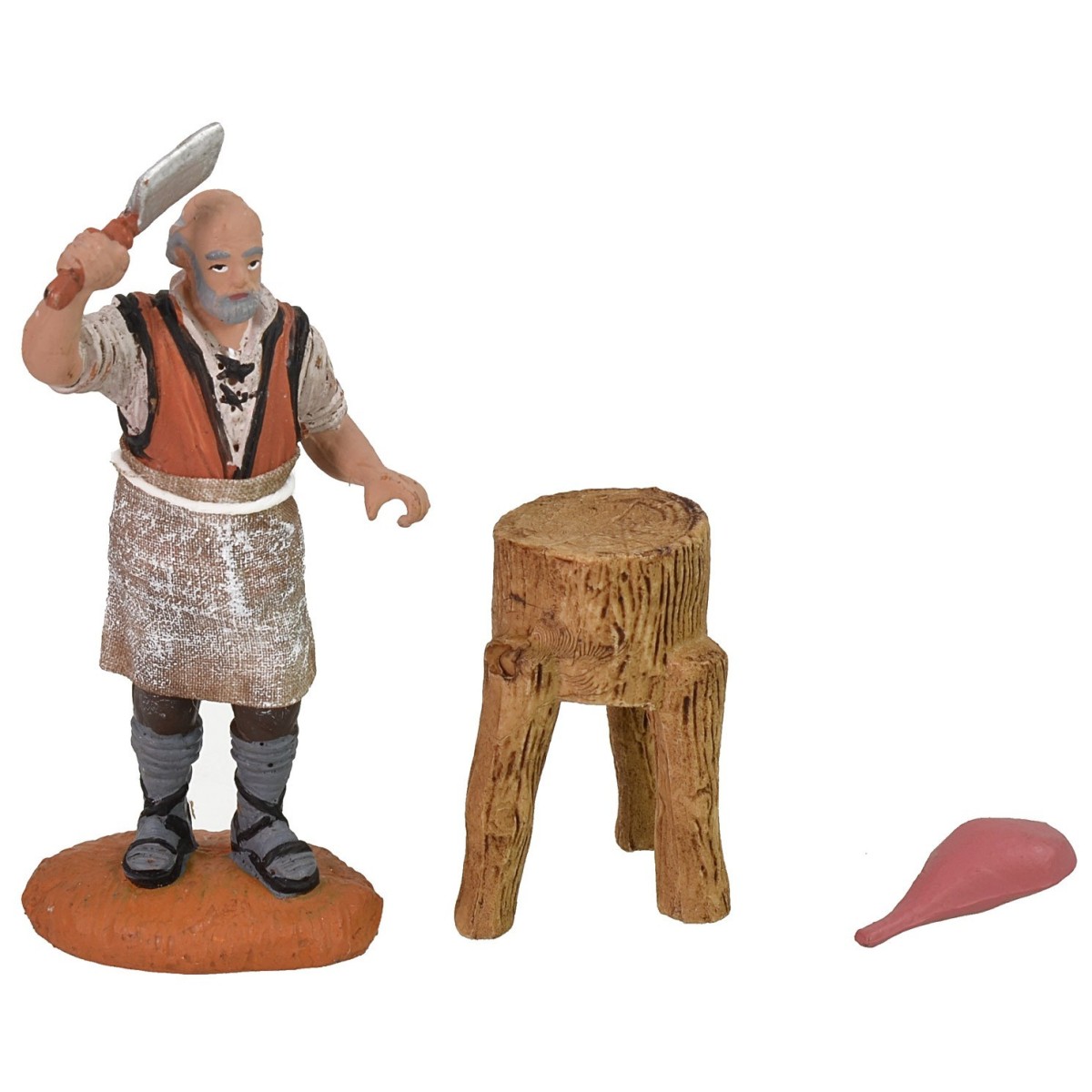 Hombre de 10 cm Oliver con un delantal de tela que empuña un hacha y despieza carne. Las estatuas de la misma serie tienen rostros expresivos y bien detallados, y están hechas de durexina (material similar al PVC).