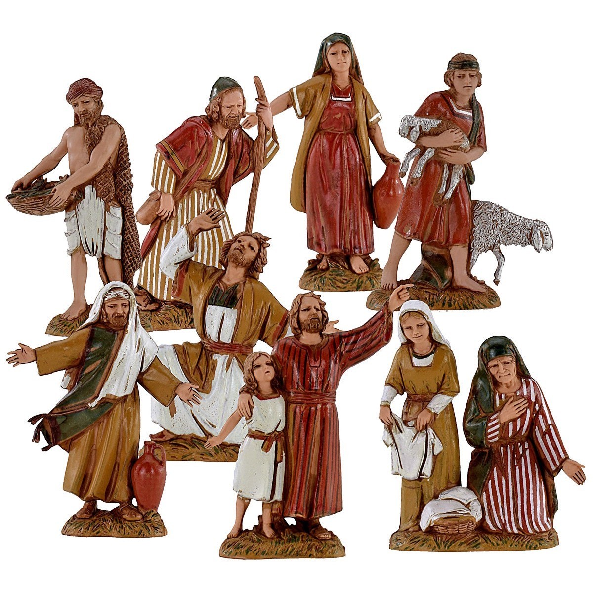 Set de 8 personajes con trajes históricos compuesto por: pastor homenajeante, hombre con jarra, hombre y niña, mujer con ánfora, hombre con bastón, pescador, pastor con ovejas y comadronas. Se precisa que la mencionada serie mide realmente alrededor de 8,5-9 cm de altura. Las estatuas de esta marca se caracterizan por el cuidado en la expresividad de los rostros y de cada detalle individual, de hecho, todas las series firmadas por Landi son producidas y pintadas a mano en Italia.