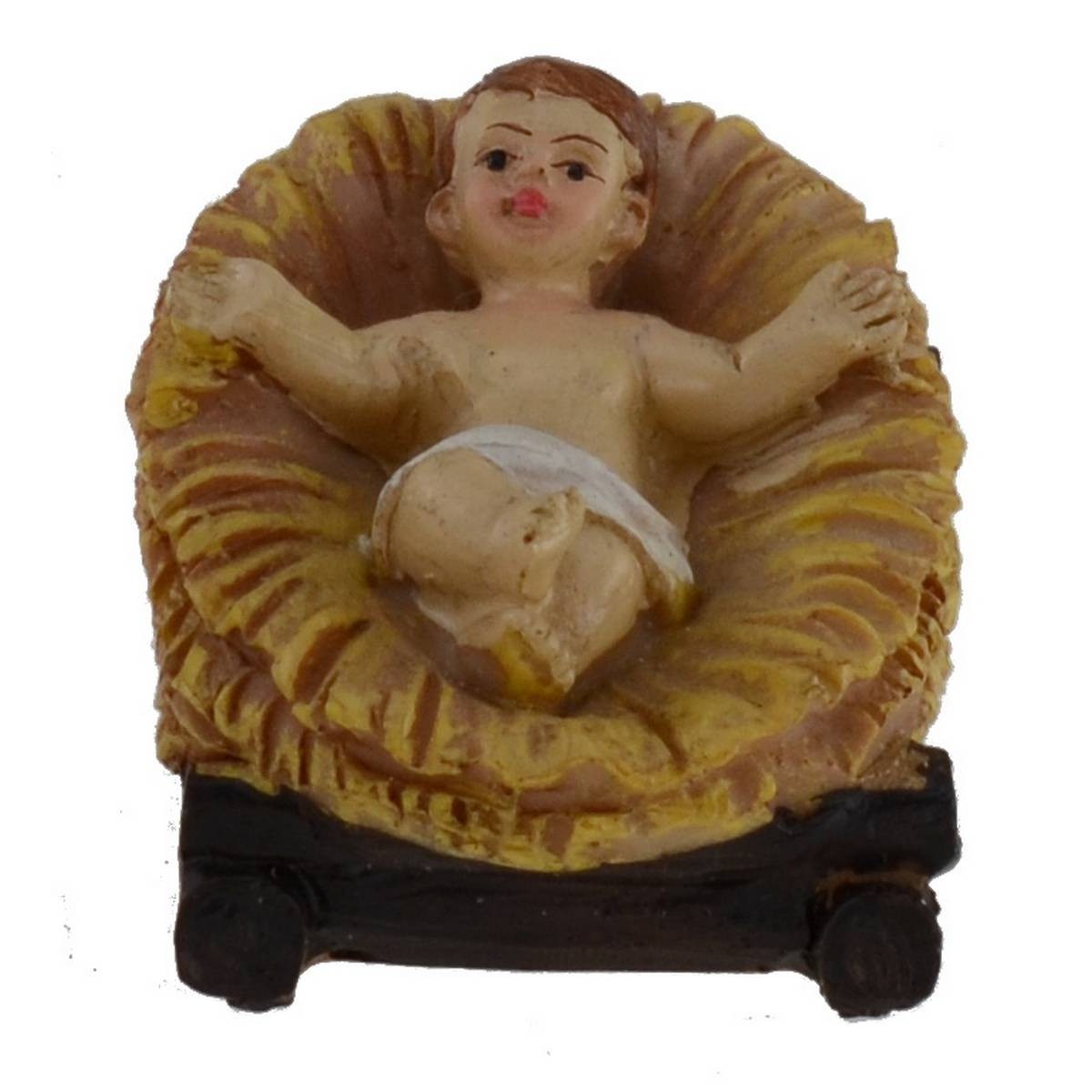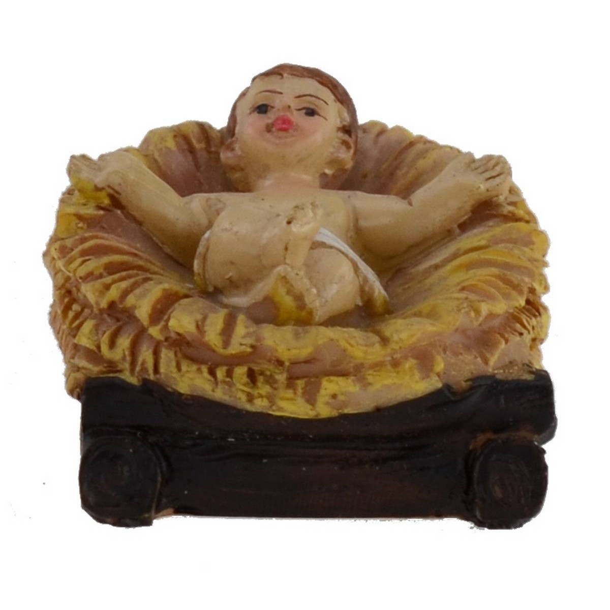 Conjunto de 11 piezas compuesto por: San José, María, Jesús en la cuna, buey, burro, tres Reyes Magos, ángel, pastor y oveja. Figuras para pesebre de resina pintadas, altura 12 cm.