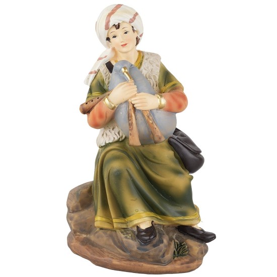 Niño sentado con zampoña en mano, realizado en resina. La figura está bien acabada en los detalles. En los productos relacionados a continuación puedes encontrar las figuras de la misma línea.