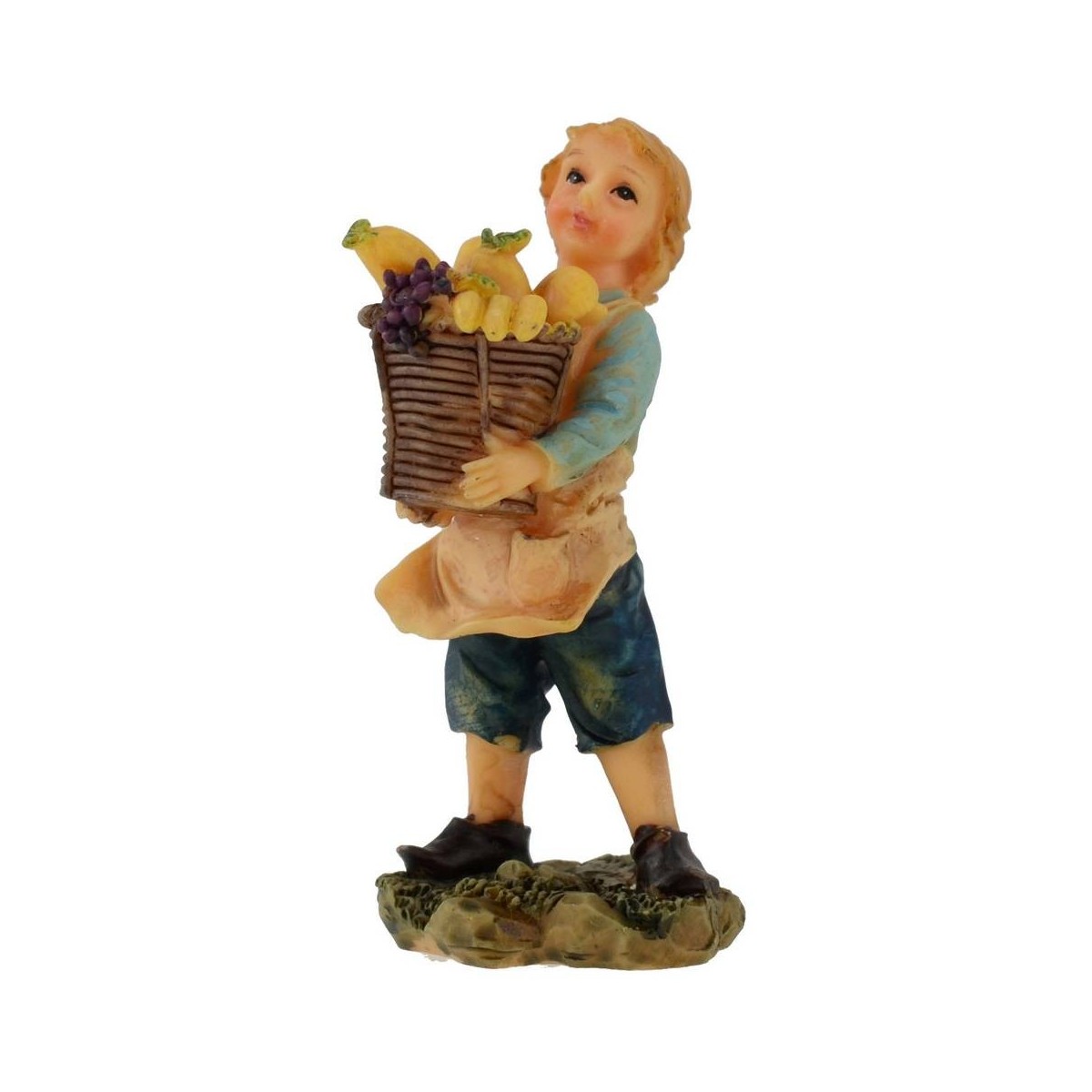 Niño con cesta de frutas y verduras en las manos, lleva un delantal beige con bolsillo, altura 12 cm en resina.