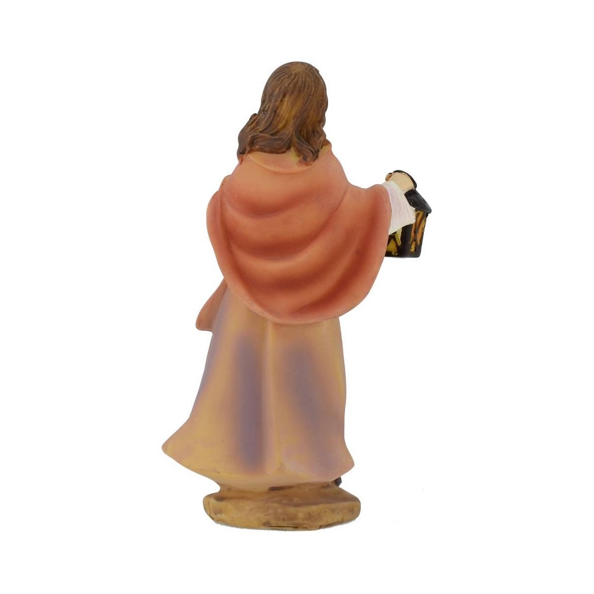 Mujer con linterna en la mano derecha, capa rosa sobre los hombros, altura 15 cm en resina.