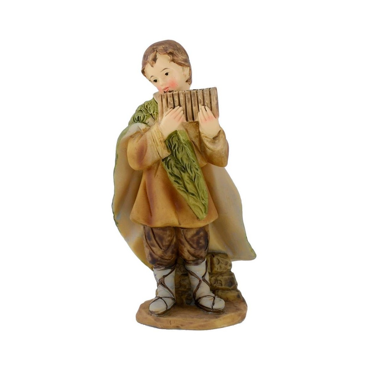 Joven tocador de armónica, apoyado en un pequeño muro, con capa de piel de oveja y botas de la serie de 15 cm de altura en resina.