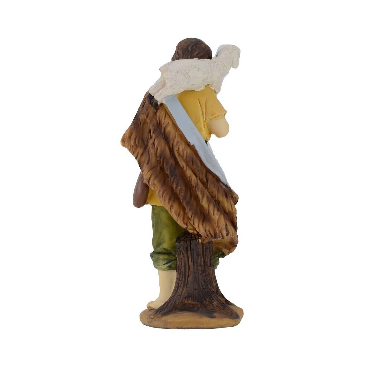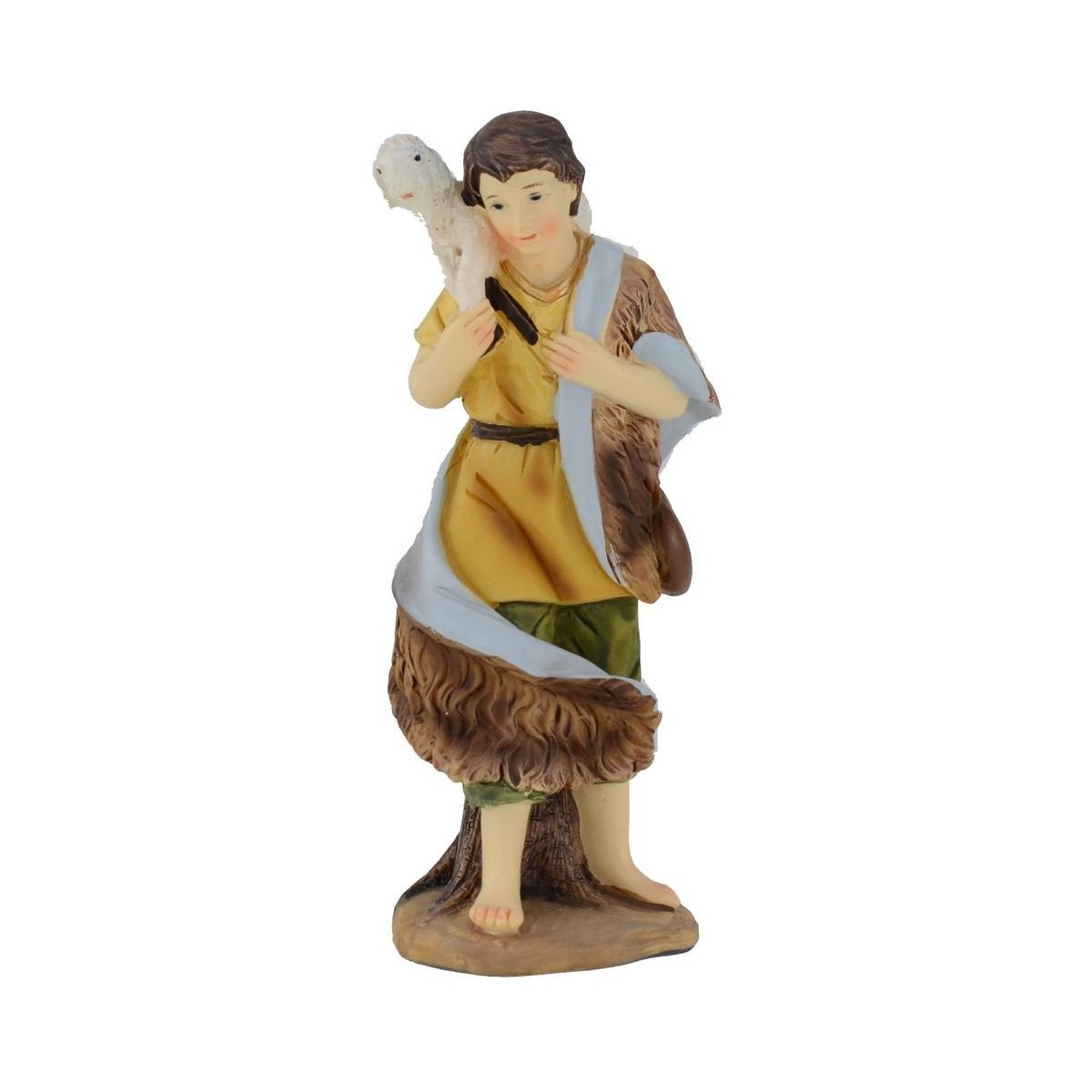 Pastor con cordero al hombro, apoyado en un pequeño tronco, con un manto marrón bordeado de azul sobre el hombro que toca los pies descalzos y bolsa cruzada, altura 15 cm en resina.