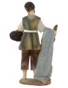Pescador con la cabeza inclinada y una red en el antebrazo derecho con la que agarra un pez, en la otra mano sostiene una cesta. Lleva una chaqueta sin mangas con un cinturón blanco en la cintura, estatua para belén de 15 cm de altura en resina.