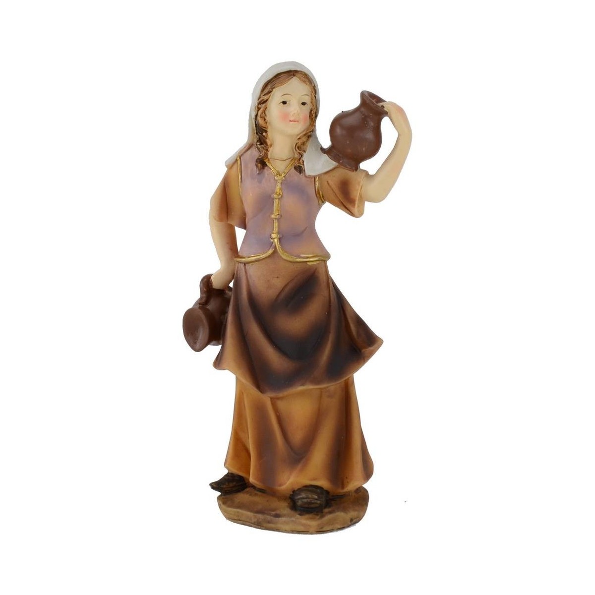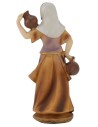 Mujer con ánfora apoyada en el hombro izquierdo y una en la mano derecha apoyada en la cadera, viste un corpiño rosa y dorado, delantal y falda larga hasta los pies y un tocado blanco, altura 15 cm en resina.
