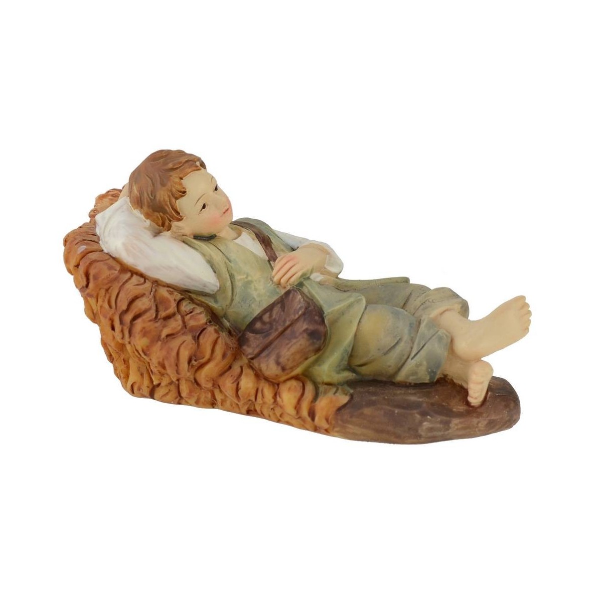 Niño acostado sobre la cama de heno con el brazo izquierdo apoyado detrás de la nuca, viste un conjunto crouset y pantalón verde con camisa blanca y bolso bandolera, altura 15 cm en resina.