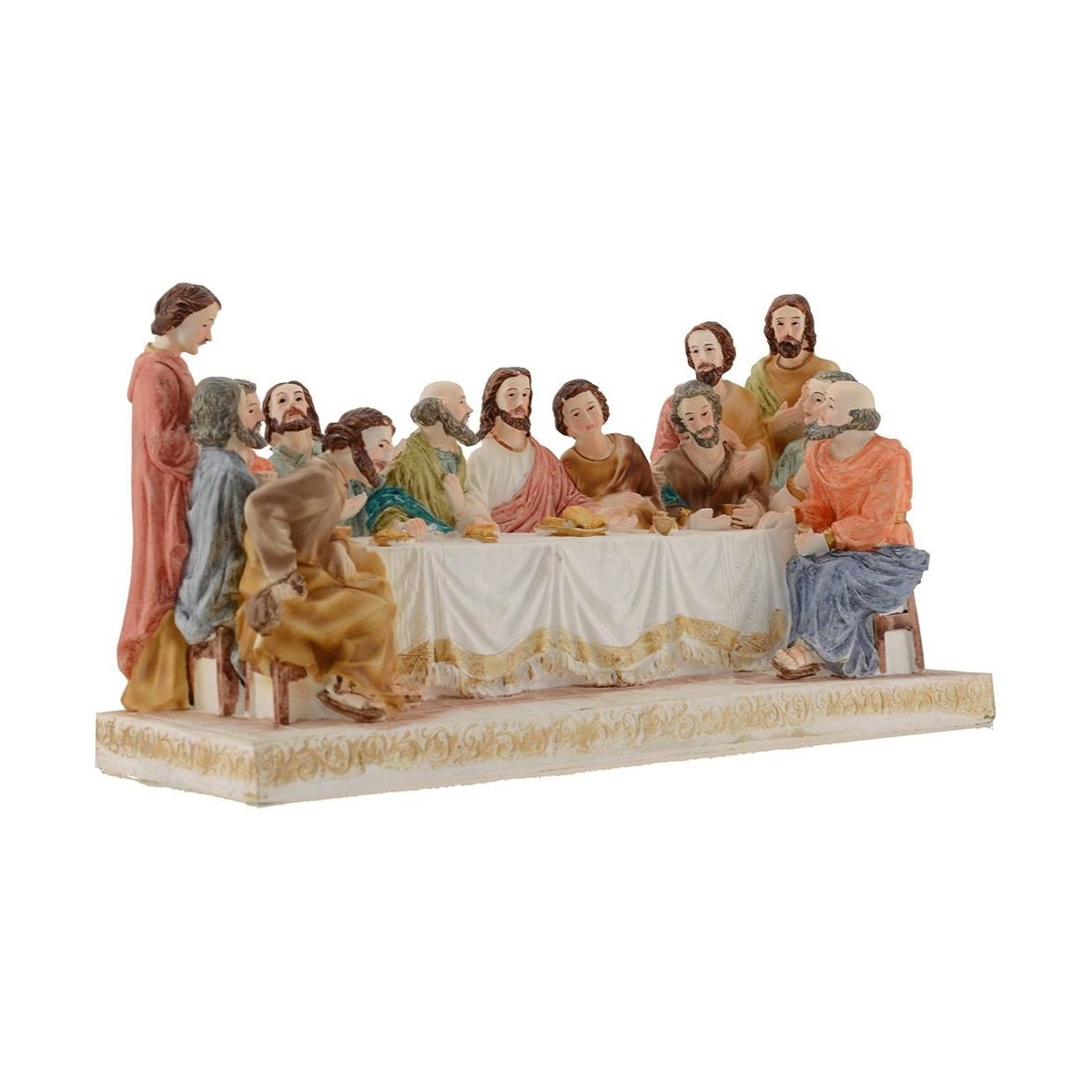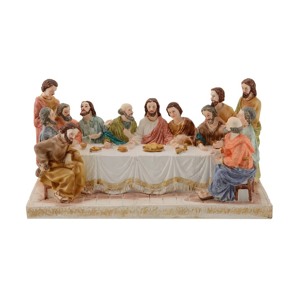 Escena de la última cena, la altura de las estatuas de pie es de 12,5-13 cm. "Mientras comían, él tomó pan, y después de bendecirlo, lo partió y se lo dio diciendo: Tomen, esto es mi cuerpo". Luego tomó una copa, después de dar gracias, se la dio a ellos y todos bebieron de ella. Él dijo: "Esta es mi sangre de la alianza, que es derramada por muchos".