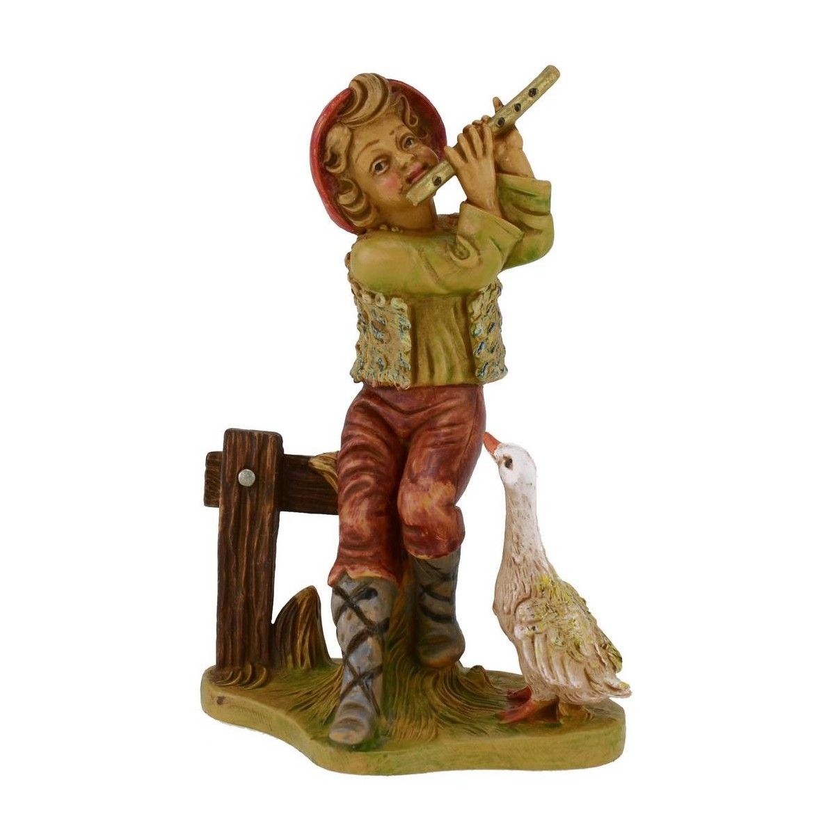 Niño sentado en una valla tocando la flauta con un ganso al lado serie cm 12 en pvc.
