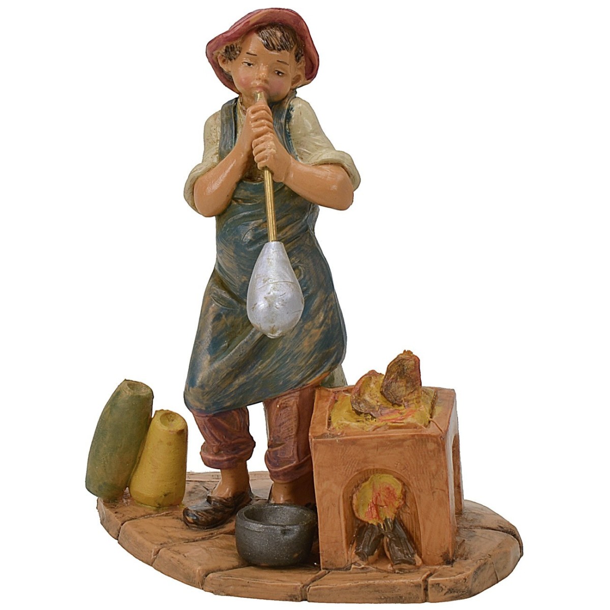 Escena compuesta por un artesano que sopla vidrio serie 12 cm Fontanini pintada a mano. Las estatuas del pesebre tradicional Fontanini, producidas a mano en Italia, tienen rostros expresivos y bien acabados en los detalles.