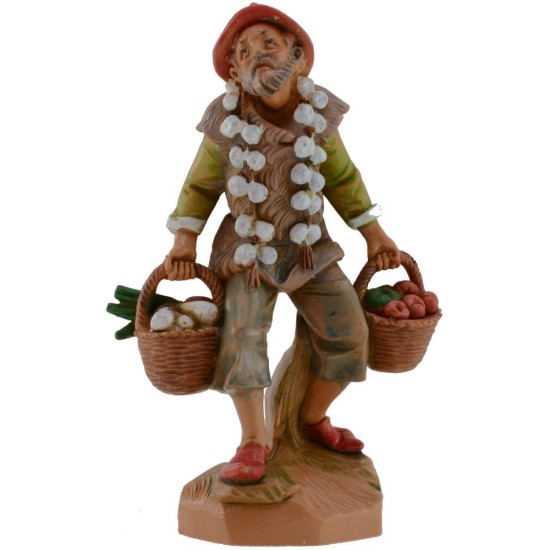 Viejo con cestas de verduras serie 12 cm Fontanini pintado a mano. Las estatuas del pesebre tradicional Fontanini tienen rostros expresivos y bien detallados.