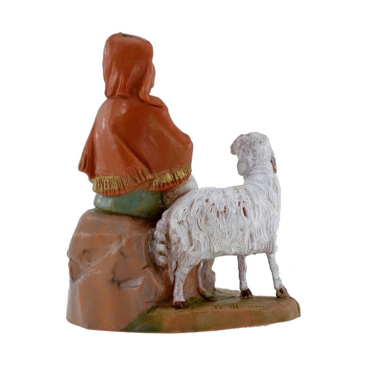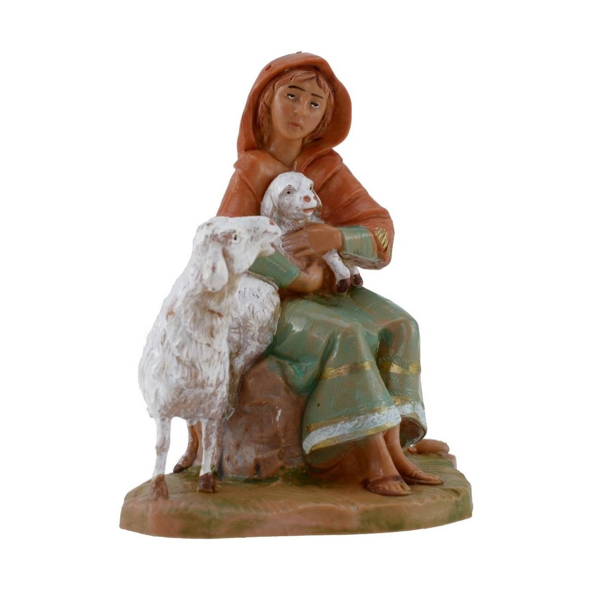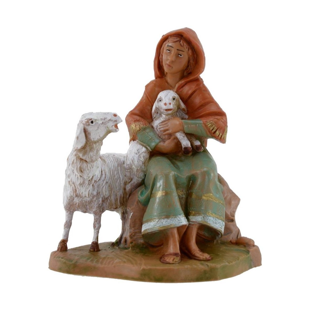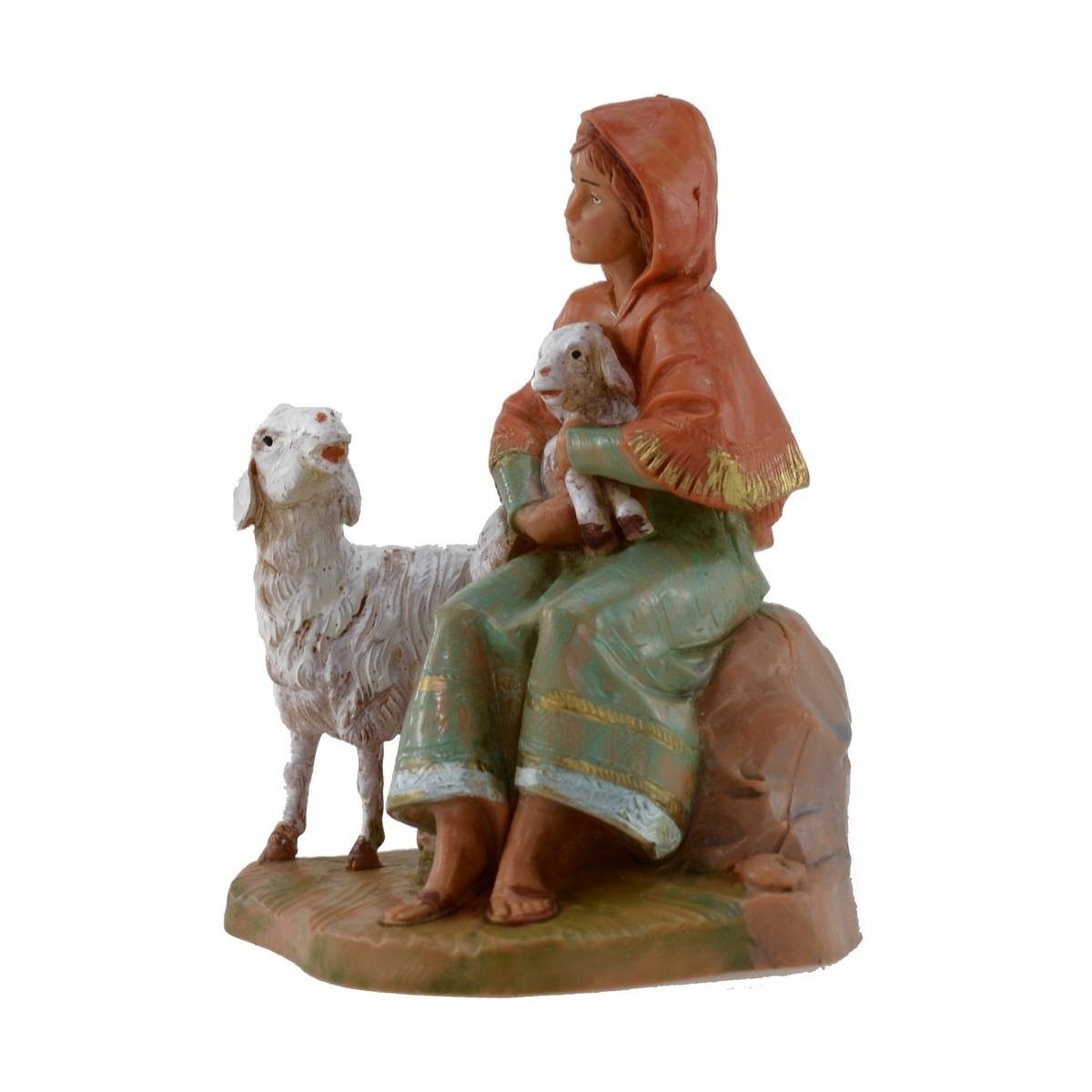 Pastora sentada con oveja y cordero serie 12 cm Fontanini pintado a mano. Las estatuas del belén tradicional Fontanini tienen rostros expresivos y bien detallados.