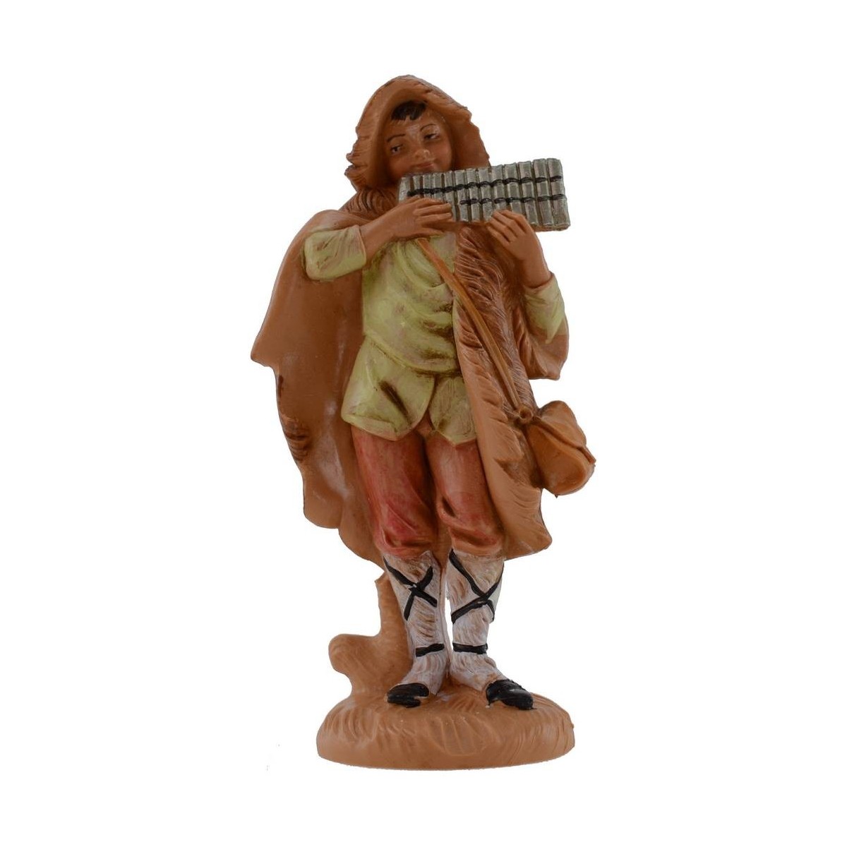Niño que toca instrumento de viento serie 12 cm Fontanini pintado a mano. Las estatuas del pesebre tradicional Fontanini tienen rostros expresivos y bien detallados.