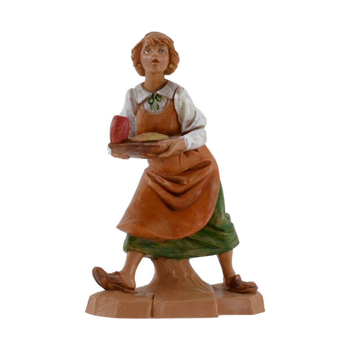 Mujer con bandeja sirviendo la cena, serie de 12 cm Fontanini pintada a mano. Las estatuas del pesebre tradicional Fontanini tienen rostros expresivos y bien detallados.