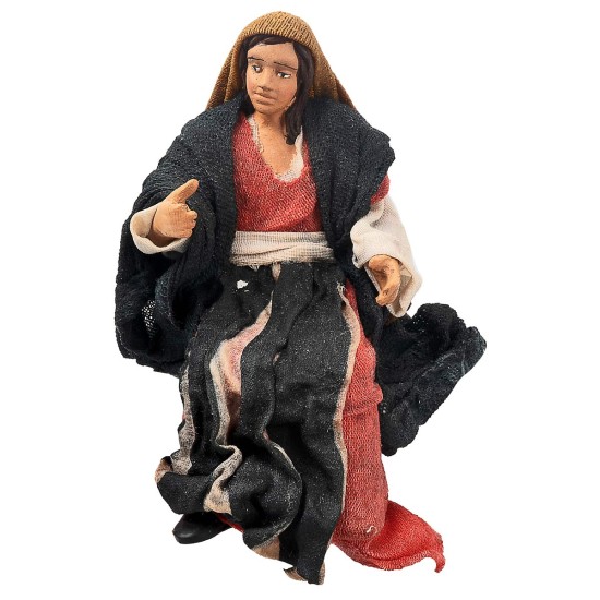 Campesina serie 12 cm en terracota con ropa de tela endurecida, representada en posición sentada, en estilo árabe-palestino. Adecuada para ser colocada en una silla, un banco o un muro dentro del pesebre.